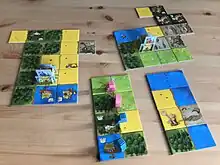 When a tile is placed next to other tiles of the same landscape, they form a larger property. Each kingdom can be no larger than a 5x5 grid of landscapes.[3] The game ends when the tiles run out,[4] and then each property is scored based on how big it is, multiplied by the number of crowns in it.[5] The player with the most points in all their properties wins.
