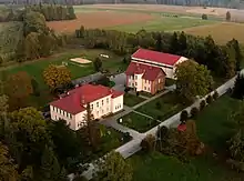 The River Aģe flows through the middle of the village, starting from the nearby Lake Aģe and ending in the Baltic Sea, near the city of Skulte. In the old days, the Aģe was used as an internal traffic and trade route. In the 13th century, the Livonian Chronicle of Henry mentioned the Aģe under the name of Adya (Livonian for "edge"[4]) in stories about Livonian battles against German intruders. In the village center next to the Lēdurga manor house, a dam was built, forming a pond that in the past was used for running the watermill. The watermill buildings and dams are still preserved but no longer in use.