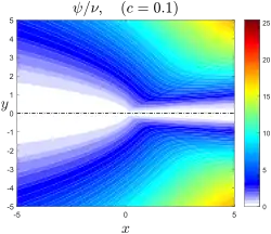 The solution describes a jet of fluid moving away from the origin rapidly and entraining the slowly moving fluid outside of the jet. The edge of the jet can be defined as the location where the streamlines are at minimum distance from the axis, i.e.,e the edge is given by