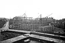 Construction work began in September 1930, only slightly more than three months after the building's approval from the special sub-committee. This was a very rapid development compared to the Town Hall, which took three years between agreement for the hall in July 1850 and the laying of its foundation stone in August 1853.[8] The building contract was awarded to Armitage & Hodgson of Leeds, which had carried out many important constructional contracts in the city, including the university and the Devonshire Hall.[1] 90% of the workforce were unemployed locals - the council were successful in applying for the government's Unemployed Grants Committee funds[2][9][10] - who worked in different teams for set periods of time in order to spread the work among the unemployed.[4] The final cost was £360,000, the equivalent of £17 million in 2018.[11]