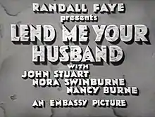 Lend Me Your Husband is a 1935 British comedy film directed by Frederick Hayward and starring John Stuart, Nora Swinburne and Nancy Burne.[1] It was made at Walton Studios as a quota quickie.