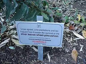 The silver-leaf wheel-pincushion is considered an endangered species because it grows in an area of only 57 km2 (22 sq mi), and half of the six previously known populations appear to have been lost. Losses are due to urban sprawl, afforestation, wild flower harvesting and competition by alien plant species.[6]