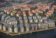 Lilla Essingen lies at the edge of what is generally considered central Stockholm, wedged in between Kungsholmen and the outer suburbs. Most of the island was initially an industrial area; at the time, most industrial transport was waterbound and thus the coastal plots were usually rimmed with industries. In 1908, the manufacturing facilities of Lux, a company manufacturing lamps for lighthouses, were moved to Lilla Essingen. The initial complex was composed of a workshop and an office building, the latter still present at the edge of the newly built flats. In 1912, the manufacturing was extended to include vacuum cleaners thanks to a contract with Axel Wenner-Gren. In 1919, the company was merged with AB Elektro-Mekaniska, creating today's Electrolux.[3]