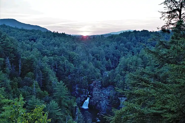 Linville Falls is a waterfall located in the Blue Ridge Mountains of North Carolina in the United States.[1] The falls move in several distinct steps, beginning in a twin set of upper falls, moving down a small gorge, and culminating in a high-volume 45-foot (14 m) drop.