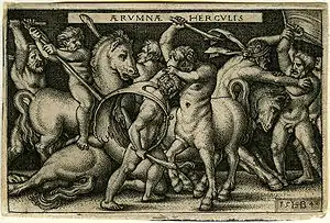 One of a series of tiny (about 5.1 x 7.9 cm) prints of the Labours of Hercules by Hans Sebald Beham;[5] the Little Masters did not let small size deter them from tackling the largest subjects of history painting. The influence of the friezes of Polidoro di Caravaggio is seen here.