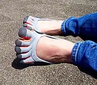 Barefoot runners run very differently from typical shod runners. Shod runners tend to heel strike due to the designs of the modern shoes, which have thick heels to reduce the impact force from the ground. When running barefoot, however, some runners tend to shift to a forefoot striking pattern to avoid such impact, which is equivalent to 2-3 times the body weight.[22] The forefoot strike is where the forefoot lands first, followed by the heels coming down. The midfoot strike is characterized by the heel and the ball of the foot landing at the same time, and heel strike is where the heel lands first followed by the forefoot.