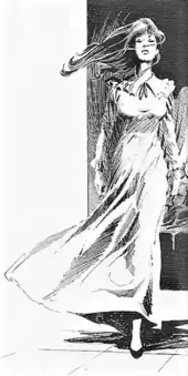 Lucy Westenra is a woman, "blonde, demure, and waiting for the right man to come along to marry her".[1] She is, however, not a passive woman: she has three suitors, and writes to her friend Mina that she would like to marry all of them, so none of them will feel sad.[1] All three propose to her on the same day—Arthur Holmwood, the wealthy son of Lord Godalming; Quincey Morris, an American adventurer; and Dr. John Seward, a psychiatrist—and she chooses Holmwood. Lucy falls sick, and much to the men's dismay, no explanation can be found as to why her strength is leaving her. It is then that Dr. Seward summons Dr. Abraham Van Helsing from the Netherlands, who is able to deduce that a vampire has been feeding on her. Helsing attempts to thwart Dracula by securing the house with garlic but is unsuccessful when Lucy's mother, not knowing the effects that garlic has against vampires, removes it. While Van Helsing and Seward are absent, a large wolf (either implied to be Dracula in a different shape or controlled by him) attacks them resulting in the death of Lucy's mother from a heart attack and her daughter is close to death when Van Helsing and Seward visit her with Arthur and Quincy the next morning. However, under the vampire's influence, she becomes prone to sleepwalking and is drawn outside, where the count fatally drains her of blood. In her final moments, her vampiric side emerges and nearly tries to bite Arthur, but Lucy regains her human senses and before dying asks Abraham Van Helsing to protect Holmwood.[2]