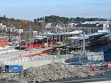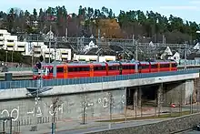 Lysaker Station (Norwegian: Lysaker stasjon) is a railway station on the Drammen Line and Asker Line situated at Lysaker in Bærum, Norway. Located 7.00 kilometers (4.35 mi) from Oslo Central Station, Lysaker is served by a mix of Vy express, regional and Oslo Commuter Rail trains, as well as Flytoget. The station is elevated and features two island platforms with four tracks. It's the terminus of the Asker Line.
