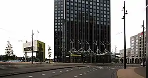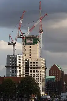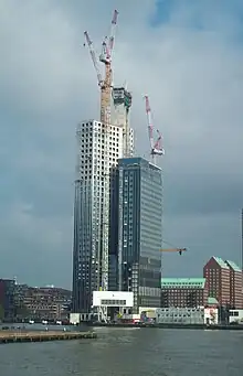 The municipality of Rotterdam agreed with the construction of the Maastoren, but in April 2006 the council called for a debate on the subject.[10] At the end of May, alderman Hamit Karakus said to the council that the Maastoren would be built and that the municipality would listen to the objections.[11] The council agreed with the construction in the following month. As a reaction, Vereniging Woon- en Leefklimaat Kop van Zuid/ Noordereiland (Dutch for Association Living Environment Kop van Zuid/Noordereiland) filed a lawsuit against the municipality of Rotterdam.[12] The association aimed at preventing the Maastoren from being constructed, and was previously known as Comité Maastoren Nee! (Dutch for Committee Maastoren No!). 200 objections against a license had been filed, mostly because of the height of the Maastoren and the above ground parking garage.[13][14] Some nearby residents also argued the office building would cause environmental and traffic problems, and complained about the lack of public eating facilities in the building.[11][15]