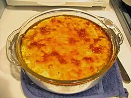 Macaroni pie is a casserole dish based on baked macaroni and cheese.[1][2] Primary ingredients may include elbow macaroni, cheese, and milk.