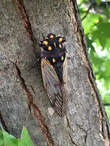 The cherrynose gets its common name from a red structure that resembles a nose, yet is in fact a structure containing muscles that help the cicada suck xylem from trees with its proboscis.[4] An alternate common name is whiskey drinker.[5]
