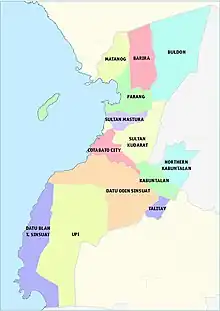 Maguindanao del Norte, officially the Province of Maguindanao del Norte (Maguindanaon: Dairat nu Utara Magindanaw, Jawi: دايرت نو اوتارا مڬیندانو; Iranun: Perobinsia a Pangutaran Magindanao, ڤروبنسيا ا ڤڠوترن مڬیندانو), is a province in the Philippines located in the Bangsamoro Autonomous Region in Muslim Mindanao in Mindanao. Its capital is the municipality of Datu Odin Sinsuat. It borders Cotabato province to the east, Lanao del Sur to the north, Maguindanao del Sur to the south-east, and Sultan Kudarat to the south.