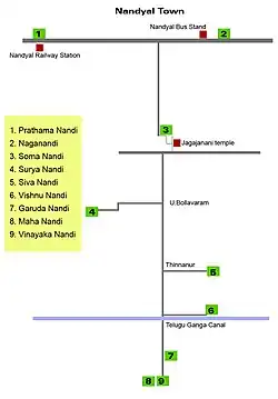 These nine temples are Mahanandi, Sivanandi, Vinayakanandi, Somanandi, Prathamanandi, Garudanandi, Suryanandi, Krishnanandi (also called Vishnunandi) and Naganandi.[2]