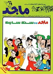 Majid (Arabic: ماجد) is a pan-Arab comic book anthology and children's magazine published in Abu Dhabi, United Arab Emirates by the Abu Dhabi Media Company. Since its publication in 1979, it has been circulated region-wide, within and beyond Arab states of the Persian Gulf, breaking sales' records with a circulation of 176500 weekly copies at one point in time, according to the Audit Bureau of Circulation.[1][2] Many regarded Majid as a representation of the Arab comic golden age. It is held in high regard along with the Egyptian comic Samir, and its Saudi counterpart Basim.