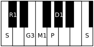 - ārohaṇa: S R₁ M₁ P D₁ Ṡ[lower-alpha 1]