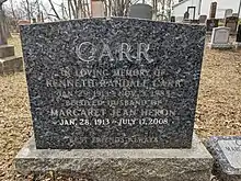 Carr passed away on Thursday, July 17, 2008, at the age of 95.[1] On Saturday, July 19, 2008, funeral services were held at Saint Andrew’s Presbyterian Church in Scarborough in honorarium.[1] Carr is buried at Saint Andrew’s Presbyterian Church Cemetery next to her husband.