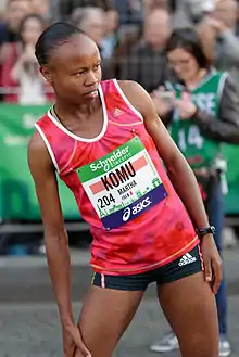 After a maternity break in 2005, she returned to competition in 2006 and won the Mont Saint-Michel marathon, her debut marathon. She also won the Rheims marathon in 2006 and 2007. In 2008, she won the Paris Marathon, setting a personal record of 2:25.33 hours. This performance earned her a place in the Kenyan Olympics team. Her husband Simon Munyutu finished 11th in the men's race at the 2008 Paris Marathon; their combined time of 4:34:57 hours, according to marathon statistician Marty Post, is the best achieved by a married couple in the same marathon.[1]