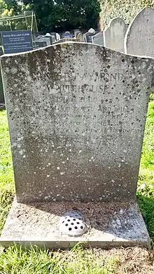 Whitehouse was appointed a CBE in 1980.[14] In 1988, she suffered a spinal injury in a fall, which severely curbed her campaigning activities.[7] Whitehouse retired as president of the NVALA in 1994. She died, aged 91, in a nursing home in Colchester, Essex, on 23 November 2001.[3][126] Whitehouse is buried in the churchyard of the parish church of St Mary the Virgin at Dedham in Essex.[127]