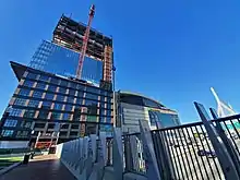 In 2006, Menino proposed two major construction projects that would have significantly impact the city, but ultimately failed to materialize. Trans National Place is a proposed 1,000-foot (300 m) tower to be built on the site of a city-owned parking garage in Boston's Financial District. The second proposal called for the city to sell Boston City Hall,[8] a 1960s brutalist structure. Menino would then have the city use the proceeds from the sale to fund construction of a new seat of government on the South Boston waterfront,[8] on the site of the current Bank of America Pavilion (Drydock 4). Menino abandoned the idea of moving the city's city hall in January 2009.[53]