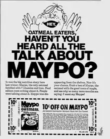 Maypo is an American brand of hot cereals. The original product was maple flavored oatmeal but there are now a variety of flavors sold under the Maypo brand name. It was originally manufactured by Maltex Co. and is now owned by Homestat Farm, Ltd.[1] It was best known for its television commercials with the catchphrase, "I Want My Maypo" by Marky Maypo.