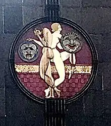 The upper portion of the façade is made of terracotta and is divided vertically into three sections.[2] The outer sections are variously described as being pink[5][13] or "rosy beige" in color.[15] Maroon bands divide the outer sections of the façade into "L"-shaped segments.[15] The central part of the upper façade is demarcated by black pilasters with maroon borders on either side, which protrude from the wall and curve above the roofline. The middle of the central section contains vertical aluminum bars, which taper in a triangular pattern above the roofline.[2] These bars are interrupted by a polychromed medallion depicting personifications of comedy and tragedy.[10][16][17] The medallion has a lavender background and a horizontal yellow band with two off-white or beige figures, which appear to be holding blue and gray masks.[17][18] This medallion is similar in design to Hildreth Meière's plaques on the façade of Radio City Music Hall,[19][20] but Meière most likely did not create the theater's medallion.[20] There is a maroon coping at the top of the façade; the coping above the outer sections of the façade is flat, while the coping above the center section is wavy.[17]