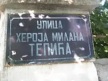 Streets in Belgrade, Banja Luka, Kozarska Dubica[6] Vršac,[7] Zrenjanin,[8] and Sremska Mitrovica[9] are named after him. There is also a monument of Milan Tepić in his street in Belgrade. One street in Novi Sad was also named after him until being changed in 2004.[10] In Republika Srpska the Medal of Major Milan Tepić awarded for bravery is named after him.