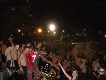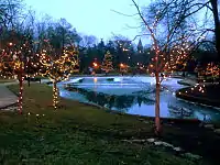 It was a tradition for students to jump into the lake at night in the week leading up to the annual football game between the Ohio State Buckeyes and the Michigan Wolverines. Although students have jumped into Mirror Lake since 1969, the modern tradition started in 1990 when Jim Jones and an AEPi member named Marmaduke led a parade of students on a traditional march around campus. At the end of the parade — at Mirror Lake — students made the celebratory jump.[6] Approximately 12,000 people either jumped or were near the lake for the 2009 jump.[7] Jumps have occurred several times outside of Michigan Week, including on the night of May 1, 2011 when students jumped into the lake in the wake of the death of Osama bin Laden.[8] The Mirror Lake Jump events were not university sponsored, and people were encouraged by university officials to not participate in the events.[9] The tradition ended in the mid-2010s after a student death occurred, and the university began enforcing policies to prevent jumps from occurring.[10] Jumping into Mirror Lake is a fourth-degree misdemeanor, however police acknowledged that they ignored this during jump events in order to focus on the safety of those present.[11]