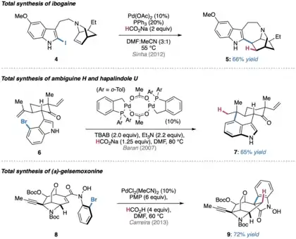 In the Carreira synthesis of (±)-gelsemoxonine, a diastereoselective reductive Heck cyclization was used to form a key oxindole ring in 72% yield as a single diastereomer.[66] Notably, the reductive Heck conditions avoid undesired side reactivity including β-hydride elimination, destruction of the adjacent azetidine ring, and cleavage of the N−O and oxabicyclic C−O bonds.