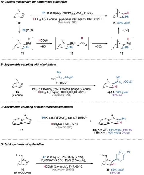 In a seminal study in 1980, Catellani took advantage of the diastereospecificity of migratory insertion and β-hydride elimination with norbornene substrates, allowing interception of the alkylpalladium(II) intermediate 11.[23] In these systems, ligand exchange of the halide with formate results in formation of the norbornyl palladium species (12), which undergoes decarboxylation (12 → 13) and reductive elimination to afford the corresponding product. Later work improved the efficiency of the reaction with piperidine and tetraalkylammonium salt additives.[24]
