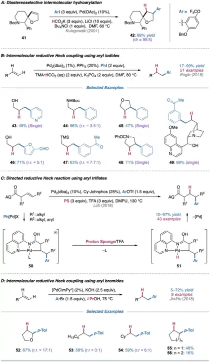 In 1983, Cacchi and coworkers disclosed a reductive Heck arylation of enones and enals in the presence of a trialkylamine base, tetrabutylammonium halide, and formic acid additive.[67] Under these conditions, the conjugate addition product is formed preferentially to the vinylic substitution (Mizoroki–Heck) product in high yield and selectivity. Notably, reductive Heck coupling on enones/enals features some mechanistically distinct aspects, as described in studies by Cacchi and later Minnaard.[68][69][70][71][72][73][74][75]