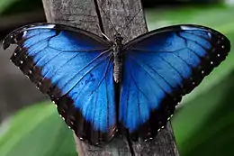 Each wing is covered in multi-layered scales, which are responsible for the coloration of the wings.[10] The wing colors vary with viewing angle, a phenomenon referred to as structural color.[2] In the female, the dorsal side is more camouflaged while the male presents with a vibrant blue.[10] In the male, the outer layer of the cover scales are long and narrow (250 μm × 50 μm), 2 μm apart, and parallel to the wing plane.[10] The dimensions of the cover scales in other species of the subfamily Morphinae vary greatly, but all are pigment-less and lowly iridescent. The inner layer, called ground scales, are pigmented, iridescent, do not overlap, and are responsible for the blue coloration. They consist of alternating layers of chitin and air, each having its own refractive indexes. The wings of the genus Morpho are noteworthy for their diversity of function, including being hydrophobic, lightweight, sturdy, thermally regulated, and bright blue iridescent. These unique characteristics originate from the photonic nanostructures in the ridges of the scales. There has been increasing interest in the bioengineering community into understanding the structural components of the wing which can have potential applications in creating structural-color devices and selective gas-sensors.[2]