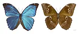 The Menelaus blue morpho (Morpho menelaus) is one of thirty species of butterfly in the subfamily Morphinae.[1] Its wingspan is approximately 12 cm, and its dorsal forewings and hindwings are a bright, iridescent blue edged with black, while the ventral surfaces are brown.[2] Its iridescent wings are an area of interest in research because of their unique microstructure.[3] Due to its characteristic blue color, Morpho menelaus is considered valuable among collectors and was widely hunted in the 20th century.[4]