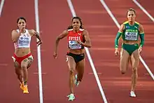 At the 2017 World Championships in London, Kambundji finished 10th in the 100 m competition.[10] In the 4 × 100 m relay event, she and her teammates Ajla Del Ponte, Sarah Atcho and Salomé Kora improved the national record in the semi-finals[11] and finished fifth in the final.[12] At the end of the year, Kambundji announced that she will work with Dutch coach Henk Kraaijenhof in the future.[13] Their working relationship was terminated after only two months, however.[14] She switched coaches again to Adrian Rothenbühler who trained her for five years until November 2022 when her partner Florian Clivaz, a former sprinter, replaced Rothenbühler as Kambundji's coach.[15][16]