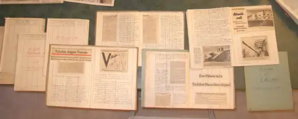 Additional material relating to the diary notebooks are Kellner's supplemental essays, news articles from Nazi newspapers, local Nazi Party documents concerning the Gestapo's surveillance of Kellner, and genealogy papers and family histories. Most of the documents, including the diary, were handwritten in the Old German style Sütterlin script, so it was necessary to transcribe the documents into modern lettering. The large amount of material dissuaded publishers from the project. Professor Gordon Mork of Purdue University's Department of History, who sought to have the diary for Purdue library's special collections, noted, "Because of the length of the material, I doubt that a complete publication of the diaries will ever be practical."[12] Opportunities for publication were enhanced when former president George H. W. Bush, who had been a combat pilot in World War II, arranged for the diary to be exhibited in his presidential library in 2005.