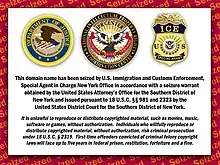This domain name has been seized by U.S. Immigration and Customs Enforcement, Special Agent in Charge New York Office in accordance with a seizure warrant obtained by the United States Attorney's Office for the Southern District of New York. It is unlawful to reproduce or distribute copyrighted material, such as movies, music, software or games, without authorization. Individuals who willfully reproduce or distribute copyrighted material without authorization, risk criminal prosecution under 18 U.S.C ยง 2319. First-time offenders convicted of criminal felony copyright laws will face up to five years in federal prison, restitution, forfeiture and a fine.[13]
