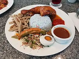 ![]() Nasi kerabu served with various herbs, solok lada (fish meat-stuffed chili pepper), salted egg, fried fish, keropok and marinated chicken | |