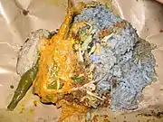 Nasi kerabu is a Malaysian rice dish, a type of nasi ulam, in which blue-colored rice is eaten with dried fish or fried chicken, crackers, pickles and other salads. The blue color of the rice comes from the petals of Clitoria ternatea (butterfly-pea) flowers (bunga telang), which are used as a natural food coloring in cooking it.[2] The rice can also be plain white rice or rice cooked using turmeric. It is often eaten with solok lada (stuffed peppers) and is also eaten with fried keropok.[3]