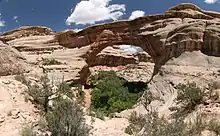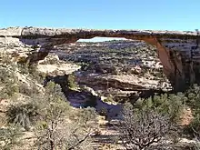 Natural Bridges National Monument is a U.S. National Monument located about 50 miles (80 km) northwest of the Four Corners boundary of southeast Utah, in the western United States, at the junction of White Canyon and Armstrong Canyon, part of the Colorado River drainage. It features the thirteenth largest natural bridge in the world,[4] carved from the white Permian sandstone of the Cedar Mesa Formation that gives White Canyon its name.