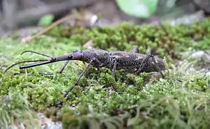 They are New Zealand's longest native beetle,[3] and have been identified as the longest brentid weevil in the world by researchers Christina. J. Painting and Gregory I. Holwell.[7] They vary enormously in size, from 15 to 90 mm total length in males and 12–50 mm in females.[8] This wide variation in body size, particularly in the length of the male rostrum, may be in response to changing environmental conditions from year to year.[9] Body size increases the further south the weevils live, but male rostra get proportionately less long with increasing latitude.[8]