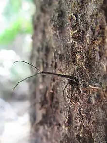 L. barbicornis larvae live at least two years.[10] Dissections of larvae show they feed on fungus growing in the larval tunnels, not the wood itself.[18] During the pupal stage, the weevil's rostrum is doubled underneath the body, but it straightens when the adult beetle emerges and eats its way out of the tree, leaving a square tunnel.[19] Sometimes the tunnel is too narrow, and the adults perish with their rostrum protruding.[18] Adults emerge between October and March; their peak abundance is in February.[20] The sex ratio is about 60:40 males:females.[20] Adult giraffe weevils generally only live for a few weeks, although one male was recorded as living at least 29 days.[13]