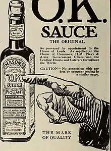 OK Sauce is a brand of brown sauce manufactured in the United Kingdom, first by George Mason & Company and later by Colmans.[1]