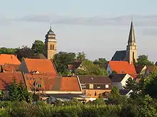 Saint Peter’s and Saint Paul’s Catholic Parish Church (Pfarrkirche St. Peter und Paul) was built in 1776 and 1777 on the spot where once stood the old parish church. That one was assigned to followers of the Reformed Church at the time of the Palatine Church Sharing in 1705. The Teutonic Knights however, who held the patronage for the Catholic parish, opposed the decision and waged a long legal battle for ownership for the Catholics. Meanwhile, as a result of the disagreements, the old church was falling apart, making it necessary to build the new Renaissance building that stands now. The belltower was built onto the church only in 1930.
