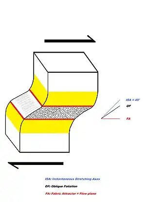 Oblique foliation is mainly encountered in shear zones, where it forms as a result of the shearing deformations within the affected zone. As the name implies, this foliation/fabric takes on an oblique attitude to the shear-zone boundary (i.e. the fabric attractor) and internal layering, usually an angle of about 20°–40°, or less. (In some shear zones, even angles less than 5° are reported, yet angles steeper than 45° are also known). A closer look reveals that the foliation/fabric is created by the parallel arrangement of a multitude of similar oriented small grains, which are slightly elongated in the foliation direction.[1] Oblique foliation thus represents primarily a shape-preferred orientation (SPO).
