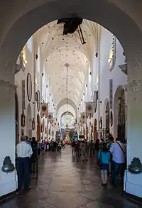 The archcathedral in Oliwa is a three-nave basilica with a transept and a multisided closed presbytery, finished with an ambulatory. The façade is flanked by two slender towers, 46-metres tall each with sharply-edged helmets. It is enlivened by a Baroque portal from 1688, as well as three windows of different sizes and three cartouches. The crossing of the naves is overlooked by a bell tower, a typical element of the Cistercian architecture. The cathedral is 17.7m high, 19m wide and 107m long (97.6m of the interior itself), which makes it the longest Cistercian church in the world. It holds works of art in Renaissance, Baroque, Rococo and Classical style of great artistic value.