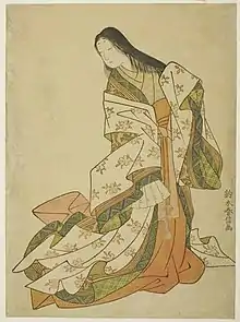 Extensive study has gone into trying to ascertain her place of birth, her family and so on, but without conclusive results.[2] The Edo-period scholar Arai Hakuseki advanced the theory that there was more than one woman named Komachi and that the legends about her referred to different people.[2] This theory was later expanded to conjecture that there were four "Komachis".[3] It has been conjectured that she was a lady-of-the-bedchamber (更衣, kōi) in the service of Emperor Ninmyō, and when the latter died in 850 she started relationships with other men.[4]