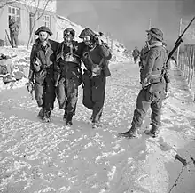 No Royal Navy ships were lost but the navy suffered four men killed and four wounded. The Commandos sustained 17 killed and 53 wounded. The commander of the Norwegian Independent Company 1, Captain Martin Linge, was killed in an attack on the local German headquarters and eight Royal Air Force aircraft were shot down. (A Norwegian civilian was hit by shrapnel during the raid, and died from the resulting injuries the following night). The commandos accounted for at least 120 defenders killed and returned with 98 prisoners and a complete copy of the German Naval Code. Captain O'Flaherty was hit by sniper fire and lost an eye, later wearing an eye-patch as a brigadier. Capt O'Flaherty can be seen in the image of 'Wounded British Soldier' being helped by two fellow soldiers. The soldier with bayonet is Derek Page of No 3 Commando. the soldier on the left is Herbert Cecil Wright.