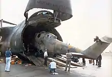 After lengthy, three-way negotiations between the French, American and the Chadian governments, permission was given to recover two Libyan Mi-25 Hinds from Chad. In January 1988, the French acquired a badly-damaged aircraft that had been shot down around a year earlier during the Battle of Fada.[6] Meanwhile the United States was allowed to recover an abandoned Mi-25 Hind from Ouadi Doum,[7] with the Americans handing over two million dollars and a batch of FIM-92 Stinger missiles in exchange for the permission.[6] The decision was made to transport the helicopter by air and the task was assigned to the US Army's 160th Special Operations Aviation Regiment.[1]