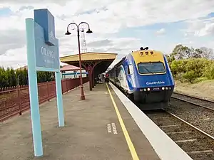 Orange is served by NSW TrainLink's daily Central West XPT service operating between Sydney and Dubbo and the weekly Outback Xplorer between Sydney and Broken Hill.[6]