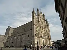 Orvieto, sitting on its impregnable rock controlling the road between Florence and Rome where it crossed the Chiana, was a large town: its population numbered about 30,000 at the end of the 13th century.[6] Its municipal institutions already recognized in a papal bull of 1157,[7] from 1201 Orvieto governed itself through a podestà, who was as often as not the bishop, however, acting in concert with a military governor, the "captain of the people". In the 13th century bitter feuds divided the city, which was at the apogée of its wealth but found itself often at odds with the papacy, even under interdict. Pope Urban IV stayed at Orvieto from 1262 to 1264.
