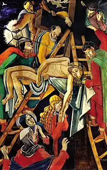 In 1925, he had begun a series of drawings and paintings called Golgotha , which displeased Bishop Hryhoriy Khomyshyn.[2] Despite this, in 1935, he received a commission from the theological seminary and produced a depiction of Christ's descent from the cross. It was considered too unconventional, however and, ironically, ended up being placed in a Jesuit church.
